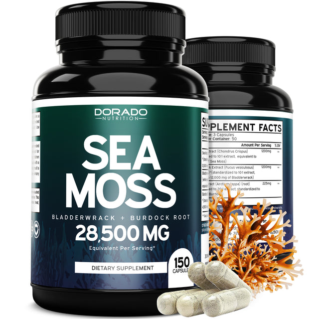 • SEA MOSS CAPSULES – Enhanced with Bladderwrack and Burdock Root. Our Irish Sea Moss Gel Capsules contain 12000mg of Irish Sea Moss Equivalent Extract, 12,000mg Bladderwrack Equivalent Extract, and 4500mg Burdock Root Equivalent Extract.